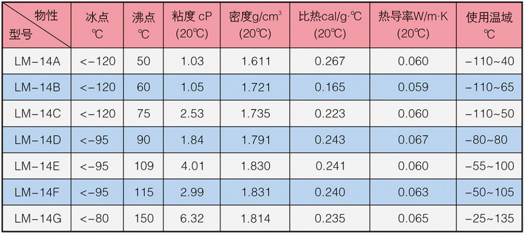 LM-14系列產(chǎn)品由全氟化合物改性而成,無閃點、不可燃,使用安全性好;臭氧消耗潛值為零,全球變暖潛能值極低,環(huán)境友好。本品具有優(yōu)異的電絕緣性能和理想的化學惰性;同時還具有優(yōu)良的導熱性能,良好的流動性,對碳鋼、不銹鋼、紫銅等金屬防銹性能優(yōu)良,具有廣泛的適用性。
