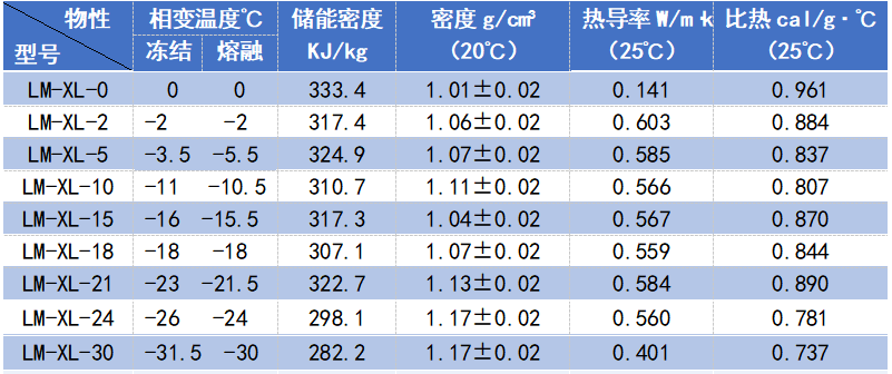 LM-XL系列產(chǎn)品由主儲能劑、相變調(diào)整劑、防過冷劑、防相分離劑、誘發(fā)劑等多組分復合制備而成。本品通過液-固-液相態(tài)變化實現(xiàn)冷能的儲存和釋放,具有較高的儲能密度及合適的比熱和導熱系數(shù)。本品不易揮發(fā)、安全可靠,可以反復使用。